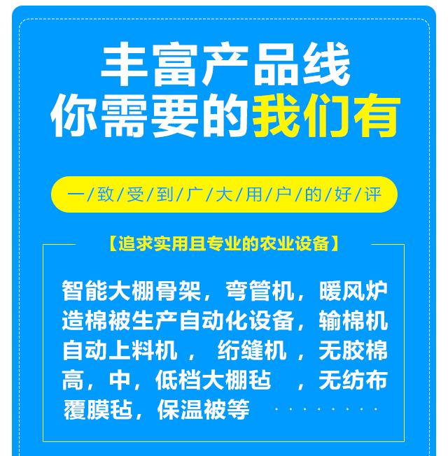本公司設(shè)備齊全,可生產(chǎn)智能大棚骨架,彎管機,暖風(fēng)爐等農(nóng)業(yè)設(shè)備,另制造棉被生產(chǎn)自動化設(shè)備,自動上料機,輸棉機,絎縫機等。質(zhì)量可靠,注重創(chuàng)新。公司擁有雄厚的實力,先進(jìn)的生產(chǎn)線,豐富的經(jīng)驗,可根據(jù)客戶的要求定做高,中,低檔大棚氈,無紡布,無膠棉,覆膜氈,保溫被等,車間日生產(chǎn)新型棉被10000平方米以上,能滿足各種客戶的需求,新型保溫被產(chǎn)品在國內(nèi)研發(fā)中始終保持在前列。